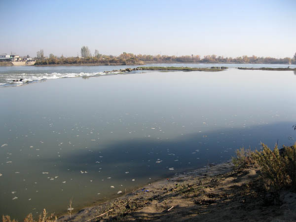 Пятеро гусей плывут по оросительному каналу с заснеженными берегами